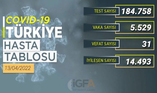 Sağlık Bakanlığı, günlük Covid-19 tablosunu 'covid19.saglik.gov.tr' sitesinden paylaştı.BURSA (İGFA) - Sağlık Bakanlığı'nın günlük COVID-19 vaka tablosuna göre son 24 saatte yapılan 184 bin 758 testten 5 bin 529 kişinin testi pozitif çıktı.31 kişinin hayatını kaybettiği son 24 saatte 14 bin 493 kişi sağlığına kavuştu. IGF