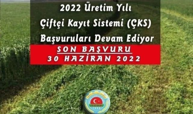 “2022 üretim yılı Çiftçi Kayıt Sistemi (ÇKS) başvuruları ve güncelleme işlemleri 30 Haziran 2022 tarihinde sona erecektir.