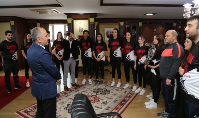 Şampiyon takımı Başkan Yardımcıları Kemal Genç ve Ahmet Murat Taviloğlu ile birlikte makamında karşılayan Rize Belediye Başkanı Rahmi Metin, Rize’ye bu gururu yaşatan sporculara teşekkür etti.