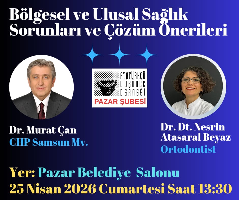AJANS PAZARAtatürkçü Düşünce Derneği Pazar Şubesi tarafından düzenlenen “Bölgesel ve Ulusal Sağlık Sorunları ve Çözüm Önerileri” başlıklı panel, 25 Nisan 2026 Cumartesi günü Pazar’da gerçekleştirilecek. Sağlık alanındaki güncel gelişmelerin ve çözüm önerilerinin ele alınacağı program, saat 13.30’da Pazar Belediye Salonu’nda başlayacak.Panele konuşmacı olarak Murat Çan ile Ortodonti Uzmanı Nesrin Atasaral Beyaz katılacak. Sağlık politikaları, bölgesel sağlık hizmetlerindeki sorunlar ve ulusal ölçekte çözüm arayışlarının değerlendirileceği etkinlikte, vatandaşların görüş ve önerileri de alınacak.Organizasyon yetkilileri, toplum sağlığını yakından ilgilendiren konuların ele alınacağı panele tüm vatandaşları davet etti. Programda özellikle sağlık hizmetlerine erişim, kamu sağlık politikaları ve yerel düzeyde yaşanan sorunlara ilişkin çözüm yollarının detaylı şekilde tartışılması bekleniyor.