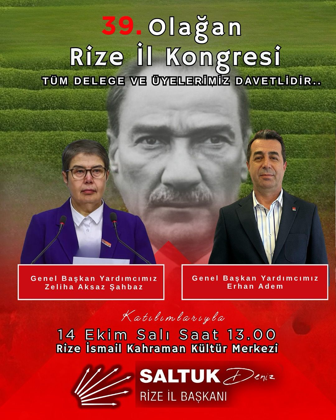 AJANS PAZARCumhuriyet Halk Partisi (CHP) Rize İl Başkanı Saltuk Deniz, 39. Olağan İl Kongresi öncesinde yaptığı açıklamayla yeniden aday olacağını duyurdu.Deniz, 12 ilçe başkanının önerisiyle yeniden aday olma kararı aldığını belirterek, “Örgütümüze bu gösterdikleri güven için teşekkür ederim.” dedi.CHP Rize İl Kongresi, 14 Ekim Salı günü saat 13.00’te Rize İsmail Kahraman Kültür Merkezi’nde gerçekleştirilecek.Kongreye, CHP Genel Başkan Yardımcıları Erhan Adem ve Zeliha Aksaz Şahbaz da katılacak.Saltuk Deniz, basın mensuplarını ve partilileri kongreye davet ederek, birlik ve dayanışma mesajı verdi.