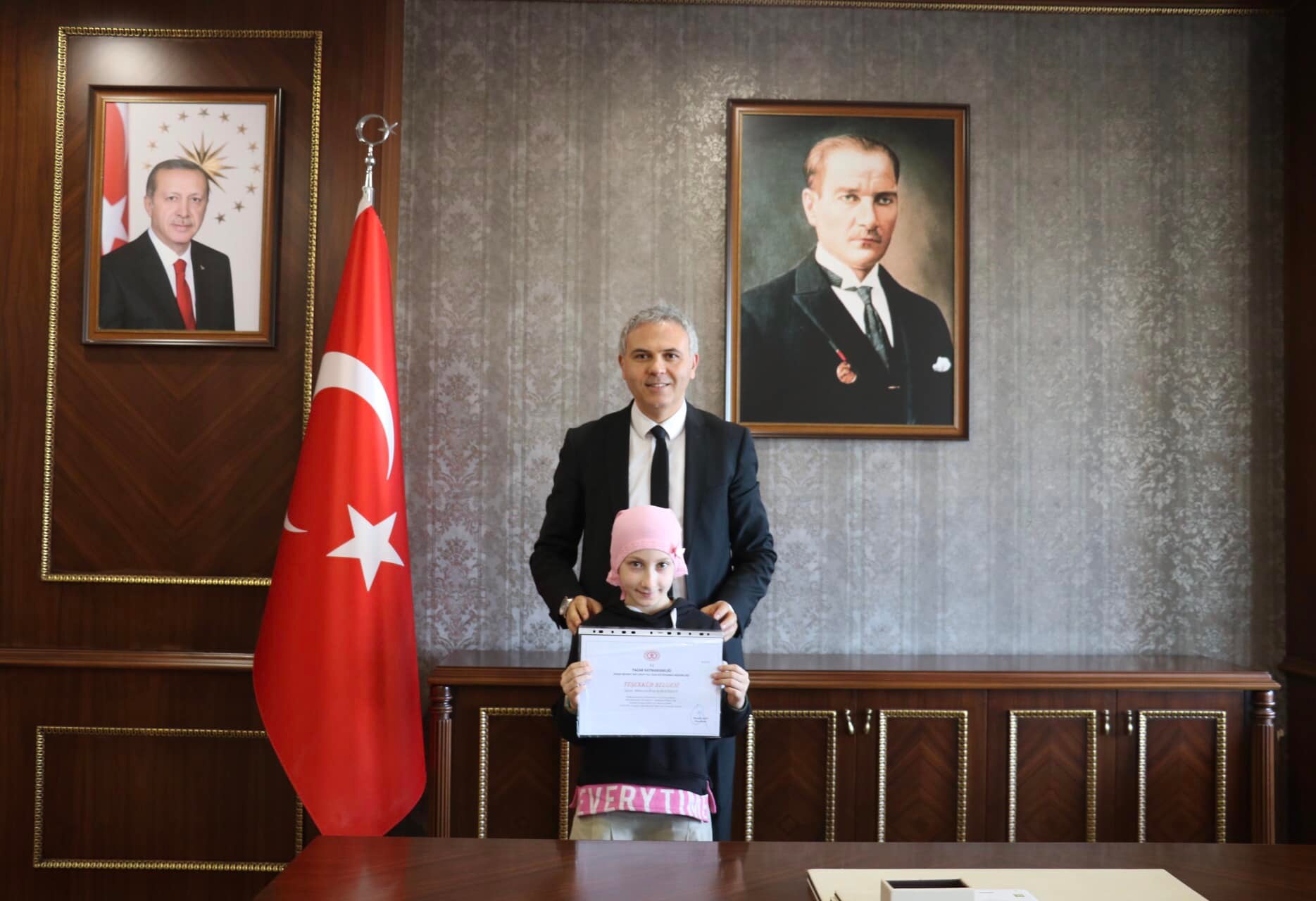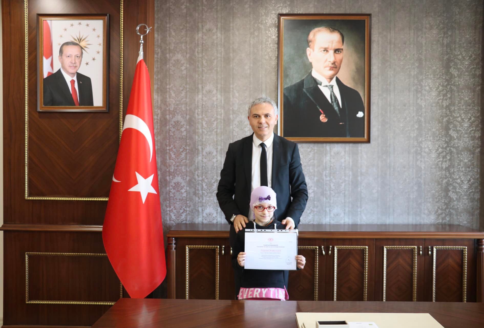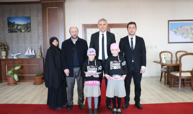 58. Kütüphane Haftası ‘Kütüphanede Hayat Var’ teması ile ilçemiz kütüphanesinde 2022 yılı Ocak ayından itibaren en çok kitap okuyan Ahmet Mesut Yılmaz İlköğretim Okulu öğrencileri Züleyha Zümra Karaosman (285 Kitap), Müberra Erva Karaosman (285 Kitap), ailesi ve Kütüphane Müdürü Akın Ortak, İlçe Kaymakamı Mustafa Akın’ı makamında ziyaret ettiler.