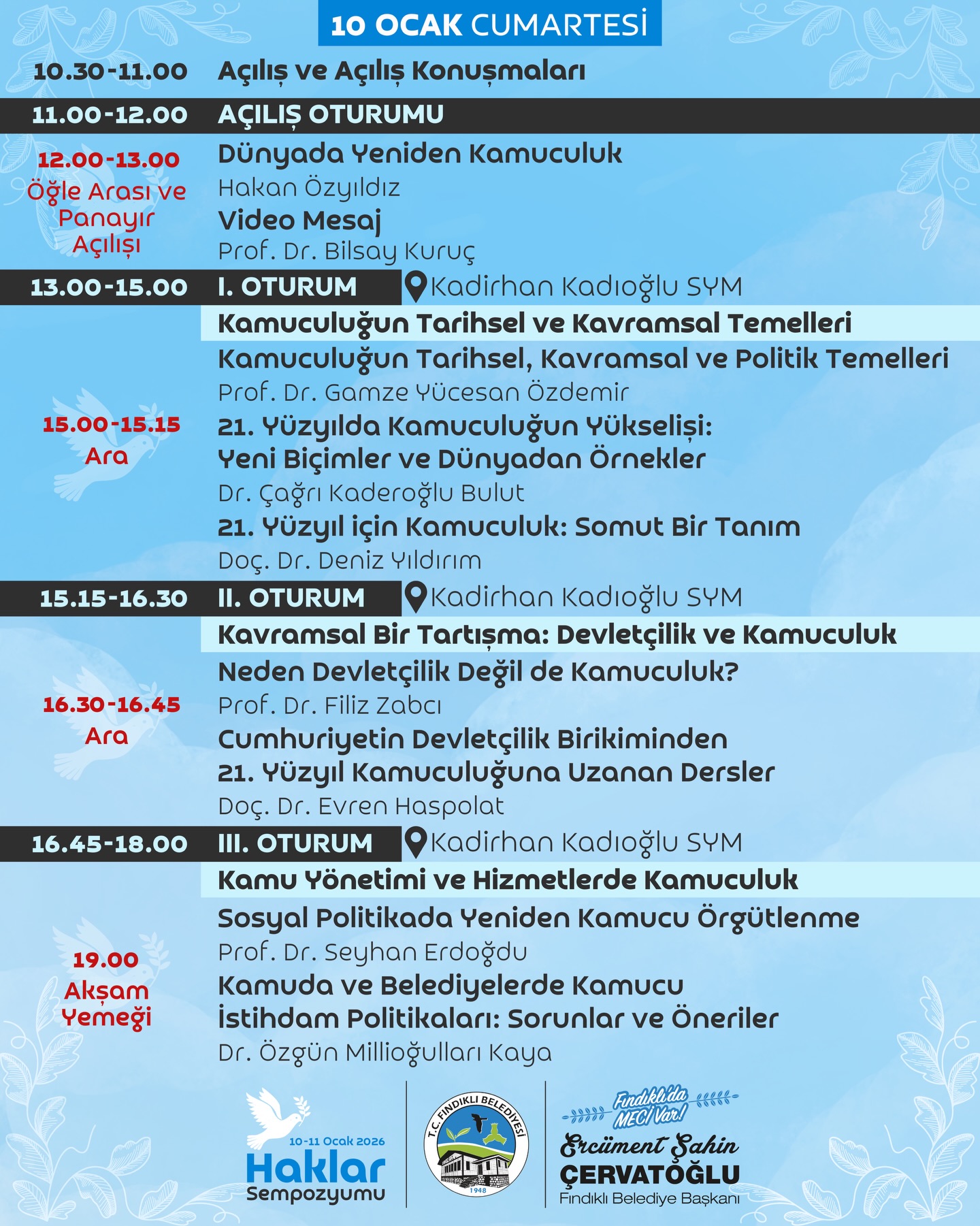 AJANS PAZARRize Fındıklı Belediyesi’nin düzenlediği ve Kamuculuk ve Kent Hakkının konuşulacağı “Haklar Sempozyumu” 10 Ocak 2026 Cumartesi günü (yarın) 10.30’da Kadirhan Kadıoğlu Sosyal Yaşam Merkezi’nde başlıyor. Sempozyum 10 – 11 Ocak tarihleri arasında gerçekleşecek.Yapılan açıklamada; “Kamuculuk ve kent hakkından toplumsal yaşama, kamusal alanlardan insan haklarına uzanan geniş bir çerçevede ortak söz üretmek için bir araya geleceğimiz 10–11 Ocak tarihleri arasında gerçekleştireceğimiz Kamuculuk ve Kent Hakkını konuşacağımız “Haklar Sempozyumu” Yarın 10.30’da Kadirhan Kadıoğlu Sosyal Yaşam Merkezi’nde başlıyor” denildi.