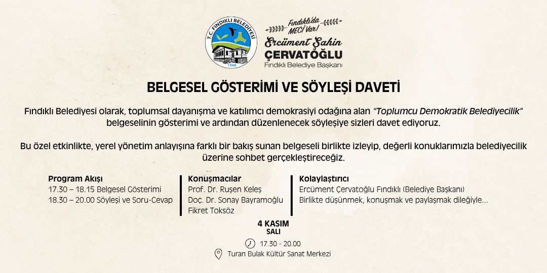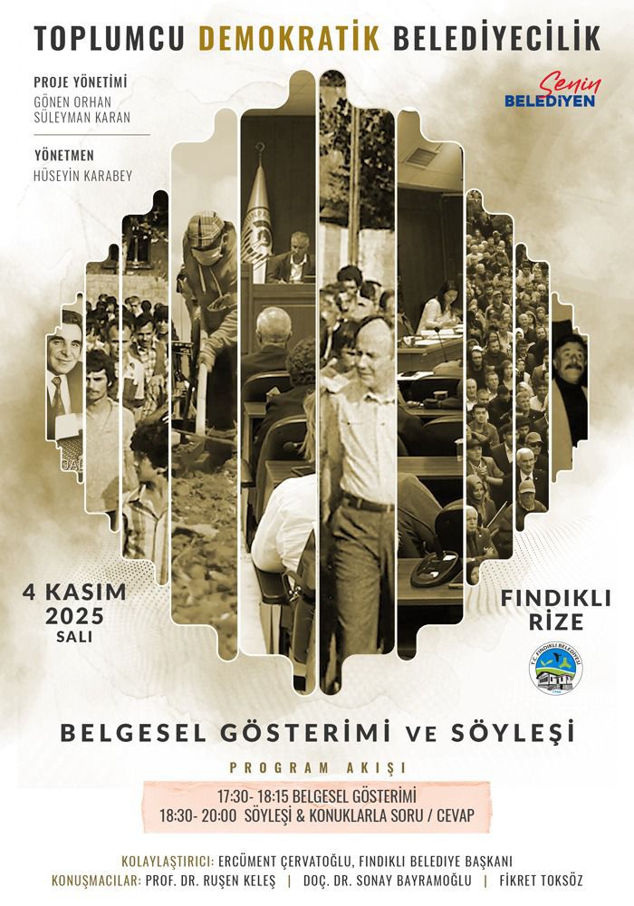 AJANS PAZARFındıklı’da, kent yönetiminde eşitlik, dayanışma ve katılım ilkelerini öne çıkaran bir etkinlik düzenleniyor. “Bir kentin hikâyesi, halkın söz hakkıyla yazılır” sloganıyla gerçekleştirilecek programda, kendi kentini birlikte yönetenlerin yolculuğu ele alınacak.Etkinlik, 4 Kasım 2025 Salı günü Fındıklı Turan Bulak Kültür ve Sanat Merkezi’nde yapılacak. Program, saat 17.30’da belgesel gösterimiyle başlayacak, ardından 18.30’da söyleşi ve soru-cevap bölümüyle devam edecek.Katılımcılar, belgesel gösterimi ve söyleşi aracılığıyla, halkın söz ve karar hakkına dayalı katılımcı kent yönetimi anlayışını tartışma fırsatı bulacak.