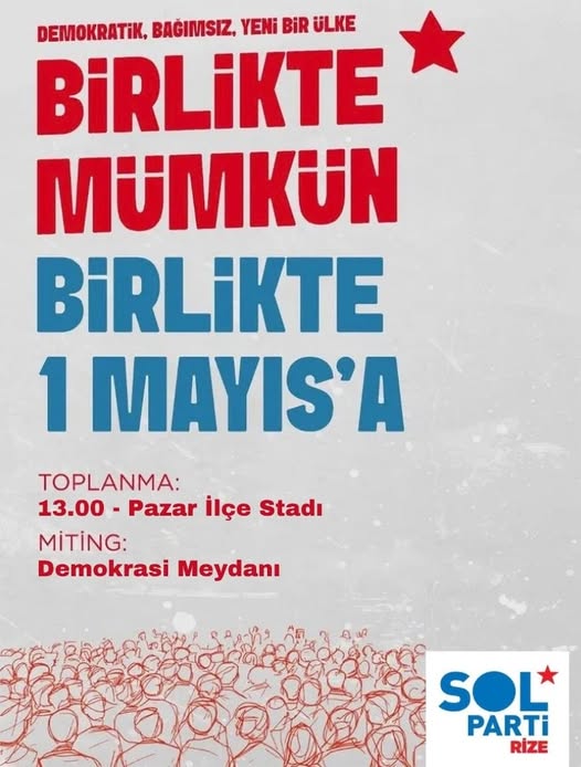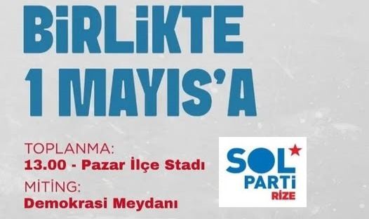AJANS PAZARSOL Parti’nin Rize İl Örgütü, 1 Mayıs Emek ve Dayanışma Günü dolayısıyla düzenlenecek etkinlik için yurttaşlara katılım çağrısında bulundu. “Demokratik, Bağımsız, Yeni Bir Ülke Birlikte Mümkün” sloganıyla yapılan çağrıda, emek, demokrasi ve dayanışma vurgusu öne çıktı.SOL Parti tarafından paylaşılan afişte, 1 Mayıs 2026 Cuma günü gerçekleştirilecek programın detayları da yer aldı. Buna göre katılımcılar saat 13.00’te Pazar İlçe Stadı önünde toplanacak. Yürüyüşün ardından miting, Pazar Demokrasi Meydanı’nda gerçekleştirilecek.Açıklamada, emekçilerin hakları, demokratikleşme ve toplumsal dayanışma taleplerinin birlikte yükseltileceği belirtilerek, tüm yurttaşlar “Birlikte 1 Mayıs’a” çağrısıyla etkinliğe davet edildi.SOL Parti Rize İl Örgütü, 1 Mayıs’ın yalnızca bir kutlama günü değil, aynı zamanda emek ve özgürlük mücadelesinin ortak sesi olduğunu vurguladı.