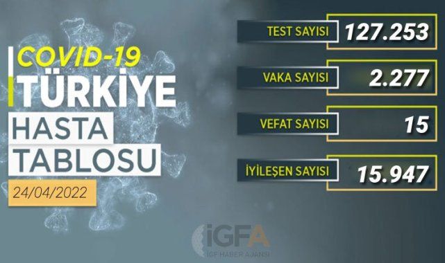 Sağlık Bakanlığı'nın yayımladığı günlük COVID-19 vaka tablosuna göreANKARA (İGFA) - Sağlık Bakanlığı, günlük COVID-19 vaka tablosunu 'covid19.saglik.gov.tr' adresinden yayımladı.Son 24 saatte PCR testine tabi tutulan 127 bin 253 kişiden 2 bin 277 yeni vaka kayıtlara geçti.15 kişinin hayatını kaybettiği son 24 saatte 15 bin 947 kişi iyileşerek sağlığına kavuştu. IGF