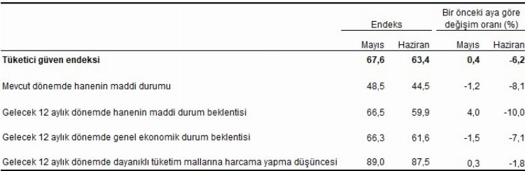 Tüketici Güven Endeksi, Haziran ayında aylık bazda yüzde 6,2 azalarak 63,4 değerini aldı.ANKARA (İGFA) - Türkiye İstatistik Kurumu (TÜİK), Haziran ayına ilişkin Tüketici Güven Endeksi'ni açıkladı.Türkiye İstatistik Kurumu ve Türkiye Cumhuriyet Merkez Bankası işbirliği ile yürütülen tüketici eğilim anketi sonuçlarından hesaplanan mevsim etkilerinden arındırılmış endeks, Haziran ayında bir önceki aya göre yüzde 6,2 oranında azaldı; Mayıs ayında 67,6 olan endeks ise Haziran ayında 63,4 oldu.Mevsim etkilerinden arındırılmış tüketici güven endeksi, alt endeksleri ve değişim oranları, Haziran 2022 verilerine şöyle yansıdı: