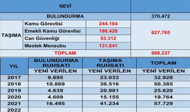 Son beş yılın rakamlarına bakıldığında ve yaşanan Covid-19 salgını da göz önüne alındığında yeni verilen ruhsatlı silah sayılarında azalma olduğu görülmektedir.