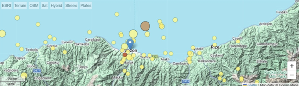 Şekilde Trabzon ve sahil kesiminde son yıllarda meydana gelen depremlerin dağılımı görülmektedir. Turuncu nokta dün meydana gelen 3.8 büyüklüğündeki, kırmızı nokta ise bugün sabah saatlerinde meydana gelen 1.3 büyüklüğündeki depremin odak lokasyonunu göstermektedir(Prof. Dr.Yener EYÜPOĞLU).