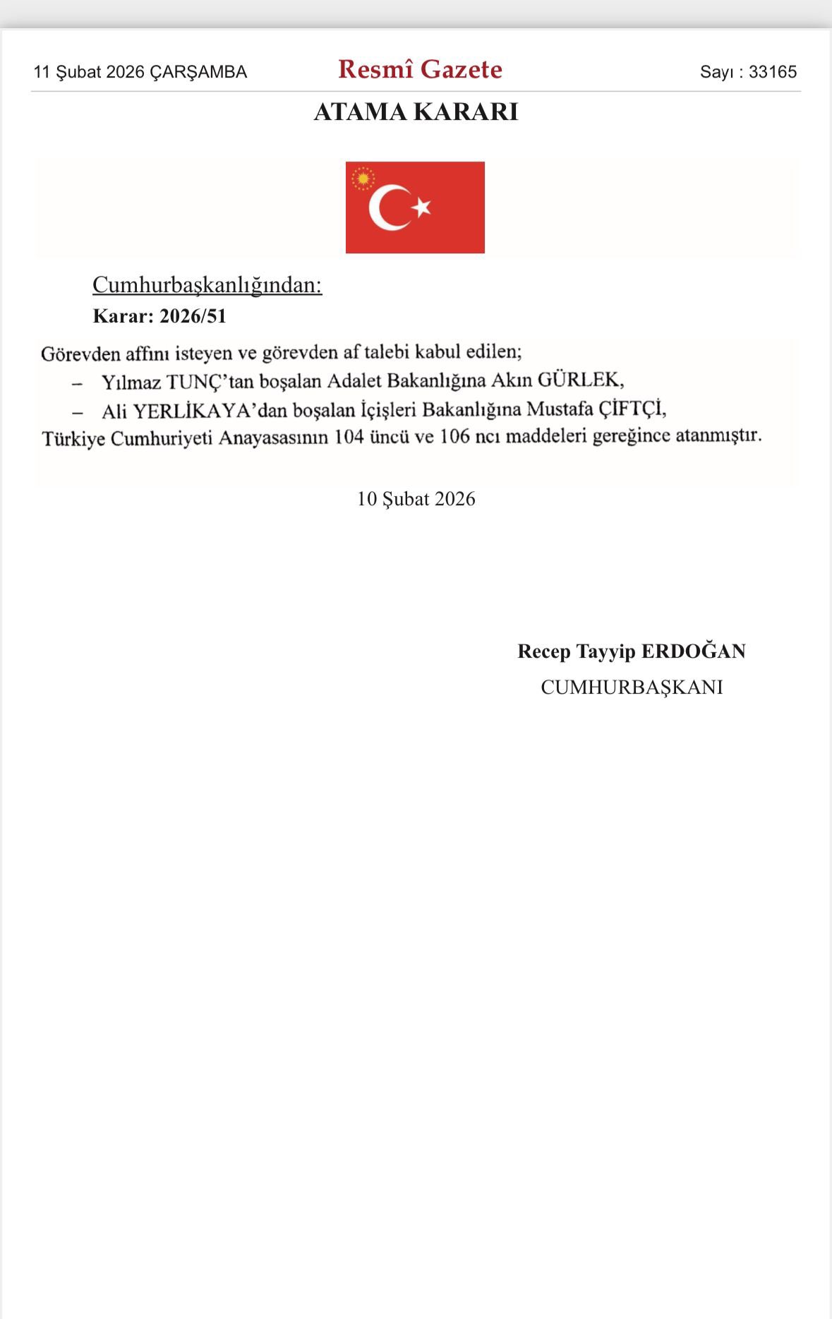 AJANS PAZARResmi Gazete'de yayımlanan Cumhurbaşkanlığı atama kararlarıyla, "affını isteyen" Adalet Bakanı Yılmaz Tunç'un yerine eski İstanbul Cumhuriyrt Başsavcısı Akın Gürlek, İçişleri Bakanı Ali Yerlikaya'nın yerine ise Erzurum Valisi Mustafa Çiftçi atandı.